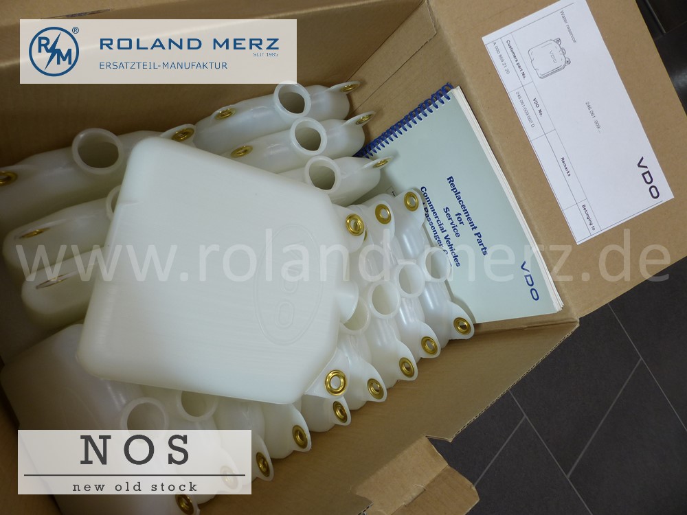 Wir konnten wir einen kleinen Bestand Original VDO Wasserbehälter (ohne Ventil) die alte verstärkte Ausführung mit den Messingösen und großen VDO Zeichen für die Mercedes Modelle 180-220SE und 190SL (MB-Nr. 000 869 07 20 / 21 20) aus einer ehemaligen VDO-Vertretung erwerben.